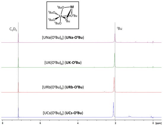 The 1H NMR spectra of the U(V)M(I) bimetallic compounds (UNa-OtBu, UK-OtBu, URb-OtBu, and UCs-OtBu) in benzene-d6 showed single resonances at 2.03, 2.05, 2.07, and 2.10 ppm, respectively, for the 6 tert-butoxide ligands surrounding the uranium(V) center (Figure 5 and Supplementary Materials Figures S3–S6). The differentiation between terminal and bridging alkoxide ligands was not possible in solution, indicating a dynamic coordination environment in UM-OtBu derivatives. This behavior may have indicated a fluxional structure with potential alkali metal cation exchange between coordination sites of the [U(OtBu)6]− octahedron, analogous to previously reported solution dynamics in actinide-alkali metal structures [16,46]. However, increasing the alkali metal size from Na to Cs resulted in a slight downfield shift (δ 2.03 ppm to δ 2.10 ppm), which reflected subtle changes in the bonding and chemical environments in solution.