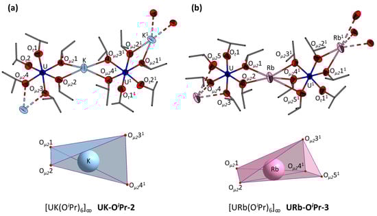 The [UM(OiPr)6]∞ derivatives based on larger alkali metal cations produced UM-OiPr-2-type (M = Na, K) and UM-OiPr-3-type (M = Rb) polymeric structures composed of interconnected [UMO6] units (Figure 7a,b). In the case of the UM-OiPr-2 derivatives, four alkoxide ligands of the U(V)-octahedron were doubly bridged (Oµ2) to the neighboring alkali metals, whereas the U(V) center in the UM-OiPr-3-type possessed five µ2-bridging iso-propoxide ligands. Consequently, the alkali metal centers were present in distorted tetrahedral (Figure 7a) or highly distorted square pyramidal coordination environments (Figure 7b), respectively.