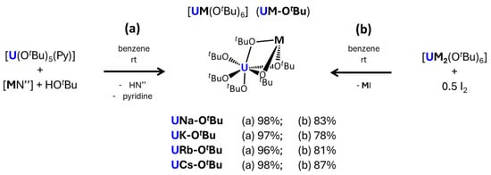 Synthesis of the pentavalent uranium alkali metal tert-butoxide [UM(OtBu)6] (UM-OtBu) (M = Li, Na, K, Rb) (a) by reacting stoichiometric ratios of [U(OtBu)5(py)], [MN”] (N” = (-N(SiMe3)2)) and HOtBu in benzene at room temperature and (b) by oxidizing the tetravalent uranium alkali metal tert-butoxides [UM2(OtBu)6] (M = Na, K, Rb, Cs) with elemental iodine. Synthetic route “a” afforded the products in nearly quantitative yields (≥96%), while route “b” gave good yields (78–87%) after filtration to remove the precipitated metal iodide salts.