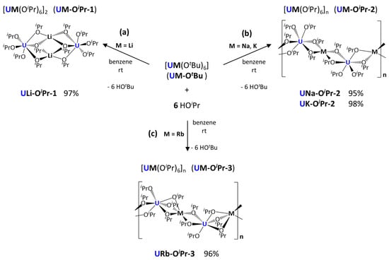 Synthesis of the mixed-metal alkali metal uranium iso-propoxides [UM(OiPr)6]n ((a) n = 2, M = Li (ULi-OiPr-1); (b) n = ∞, M = Na (UNa-OiPr-2), K (UK-OiPr-2); (c) n = ∞, M = Rb (URb-OiPr-3)) in nearly quantitative yields (≥96%) by trans-alcoholysis of the tert-butoxide compounds [ULi(OtBu)6(Et2O)] [16] UNa-OtBu, UK-OtBu, and URb-OtBu with iso-propyl alcohol.