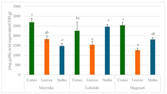Bar graph of total content of phenolic compounds in analyzed hops anatomical part. Values denoted with different letters differ statistically significantly (p ≤ 0.05).
