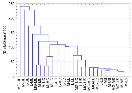 Hierarchical cluster analysis obtained based on the content of phenolic compounds (mg/100 g) in studied samples. Marynka—M; Lubelski—L; Magnum—MG; lower hops cones—LC; middle hops cones—MC; upper hops cones—UC; lower hops leaves—LL; middle hops leaves—ML; upper hops leaves—UL; lower hops stalks—LS; middle hops stalks—MS; upper hops stalks—US.