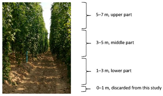 Three randomly selected plants were chosen for the study, which normally would be harvested for the beer industry. Each plant was divided into three parts: bottom (1–3 m above the ground), middle (3–5 m), and upper (5–7 m) (Figure 3).