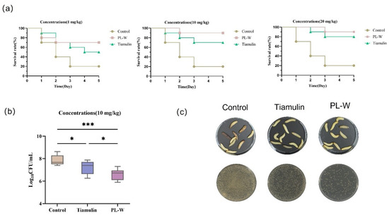 In vivo evaluation of MRSA ATCC33591 infection using the G. mellonella larvae model. (a) Survival of G. mellonella when infected with PL-W or tiamulin-resistant MRSA ATCC33591 (n = 10). (b) Effects of PL-W and tiamulin in G. mellonella larvae 2 h after MRSA ATCC33591 infection. After inoculation with MRSA ATCC33591, larvae were administered PL-W or tiamulin at 10 mg/kg. Number of CFUs in larvae treated with PL-W or tiamulin 8 h post-infection. * p < 0.05, *** p < 0.001. (c) After treatment with PL-W or tiamulin for 8 h, the state of the G. mellonella larvae and the bacterial count on the plate diluted 10,000-fold were evaluated.