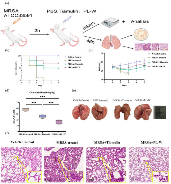 Mice were infected with MRSA ATCC33591 to establish an acute pneumonia model. The survival rate in the vehicle control group was 100%, whereas that in the MRSA-treated group was 0% by day 3. It is essential to highlight that at an administration concentration of 10 mg/kg, the survival rate for PL-W was 70%, whereas the survival rate for tiamulin was 50%. The body weight of mice in the vehicle control group remained stable, whereas that of mice in the MRSA-treated group decreased until death. In the tiamulin-treated and PL-W-treated groups, body weight decreased during the first 2 days but recovered thereafter. Compared with the vehicle control group, the weight of mice in the MRSA + PL-W group was different (p < 0.01), whereas the weight of mice in the MRSA and MRSA + tiamulin groups was significantly different (p < 0.001). The plate count results for lung tissue showed that the number of colonies in the MRSA + PL-W group was significantly lower than that in the MRSA-treated group and the MRSA + tiamulin group (p < 0.001). In terms of organ appearance, the lung tissue in the vehicle control group exhibited uniform color and luster, was soft and elastic in texture, and showed no evident lesions. In contrast, the MRSA-treated group exhibited a markedly deeper dark red color with a rough and uneven surface. The MRSA + tiamulin and MRSA + PL-W groups significantly improved. Hematoxylin and eosin (H&E)-stained sections demonstrated that the lung tissue structure in the vehicle control group was well preserved. In contrast, the MRSA-treated group exhibited extensive inflammatory foci with a significant aggregation of inflammatory cells within the alveolar structures. Both the tiamulin-treated and PL-W-treated groups showed improvements compared to the MRSA-treated group. The MRSA + PL-W group exhibited a clearer alveolar tissue structure with reduced inflammatory cell infiltration in the alveolar spaces, indicating superior repair and the lowest degree of injury. Collectively, PL-W exhibited potent antibacterial effects in vivo in our mouse model (Figure 6).
