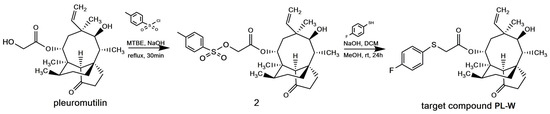 Pleuromutilin (3.78 g, 1.0 equiv) was dissolved in methyl tert-butyl ether (MTBE, 30 mL). p-toluenesulfonyl chloride (2.27 g, 1.2 equiv) was added to the solution. Aqueous NaOH (10 N, 2.0 equiv, 2 mL) was added dropwise and the mixture was refluxed for 1 h. The reaction mixture was filtered to collect the residue, which was washed with MTBE and dried under a vacuum, yielding intermediate 2 that was characterized and soon used for the consecutive reaction, without any further purification. Intermediate 2 (0.53 g, considered to be 1.0 equiv) was dissolved in dichloromethane (DCM, 10 mL). 4-Fluorothiophenol (0.24 g, 1.0 equiv) was added to the solution. A methanolic NaOH solution (5 wt%, 1.2 equiv, 1 mL) was added dropwise and the mixture was stirred at room temperature for 24 h. The reaction mixture was concentrated under reduced pressure and the residue was dissolved in DCM (20 mL). The organic layer was extracted with saturated NaCl solution (10 mL × 2). The combined organic phases were dried over anhydrous Na2SO4, filtered, and concentrated. The crude product was purified by silica gel column chromatography using a mobile phase of petroleum ether (PE): ethyl acetate (EA) = 1:1. A pale yellow solid was obtained (yield: 69%, 0.198 g). The target product, S-(4-fluorophenyl)-pleuromutilin (PL-W), was characterized and confirmed using nuclear magnetic resonance (NMR) spectroscopy.