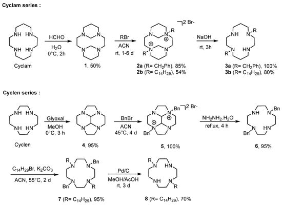 The synthetic routes used to synthesize cyclam- and cyclen-based ligands are shown in Scheme 1. In the cyclam series, compound 2a and 2b were prepared from cyclam bisformyl 1 according to literature procedures [36]. This intermediate allows the preparation of trans N,N′-disubstituted cyclams with good yields and at room temperature. Noteworthily, in the case of compound 2b, extending the reaction time to six days was necessary due to the lesser reactivity of 1-bromotetradecane. Diammonium salts 2a and 2b were isolated by precipitation. After hydrolysis of the bis-aminal protective groups in aqueous NaOH 3.0 M, compound 3a and 3b were obtained in 100% and 80% yields, respectively [36]. In the cyclen series, compound 6 [37] was synthesized according to literature procedures before being alkylated with a slight excess of 1-bromotetradecane in acetonitrile (ACN) and potassium carbonate as a base. The resulting tetra-alkylated product 7 was finally submitted to hydrogenation with Pd/C as a catalyst for three days to furnish the target compound 8 in 70% yields over the two steps.