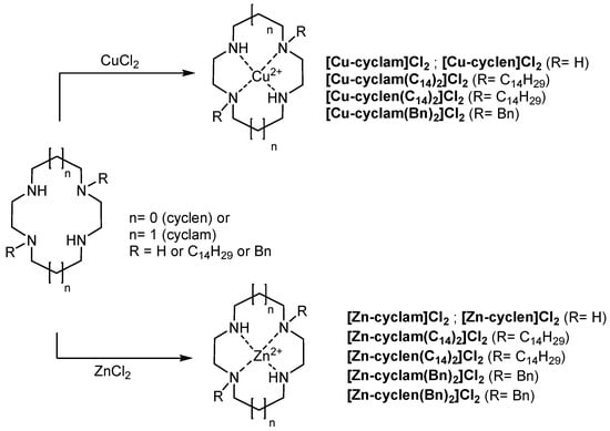 Subsequently, metal complexes of the tetraazamacrocycles were prepared as depicted in Scheme 2. Copper(II) chloride (CuCl2) and zinc(II) chloride (ZnCl2) were used as salts. Briefly, the non-functionalized Cu/Zn-Cyclam and Cu/Zn-Cyclen complexes were synthesized in hot water and isolated quantitatively. In the case of the N-benzylated Cu/Zn-Cyclen(Bn)2 complexes, ligands were dissolved in ACN and an aqueous solution of metal salt was added. The corresponding complexes were isolated by precipitation with moderate yields (65% and 43%, respectively). Due to their low solubility in water, Nalkylated Cu/Zn-Cyclam(C14)2 was synthesized in organic solvent (MeOH or DCM/MeOH mixture) at room temperature or with slight heating. Targeted compounds were isolated in high yields (90%).