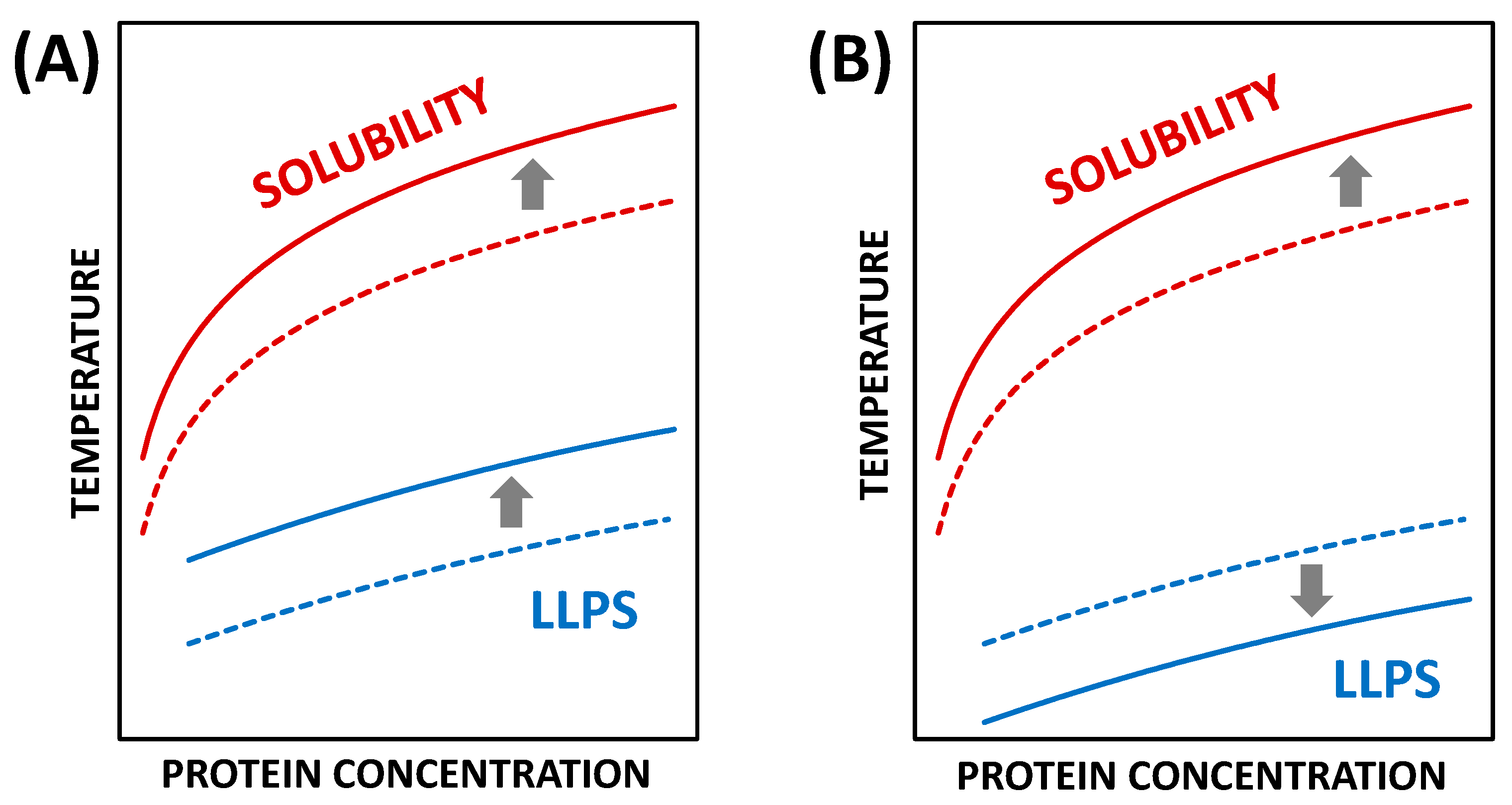 33]. These liquid phases may eventually generate protein crystals. An additive that increases protein–protein attraction reduces the thermodynamic stability of homogenous protein samples. This causes both the solubility and the LLPS boundary to shift toward higher temperatures (see solid curves in