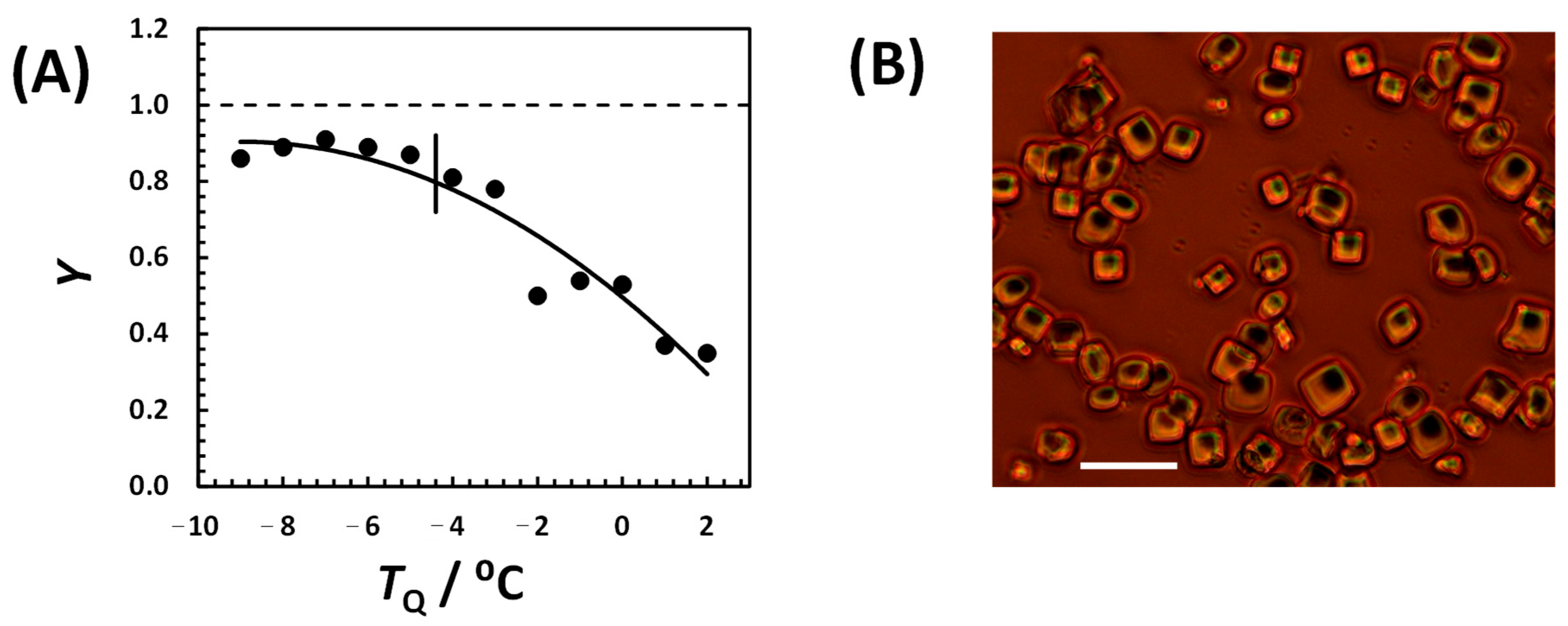 Figure 7A. At the higher NaCl concentration, crystallization yield also increased as quenching temperature decreased. However, high values of Y ≈ 90% were already reached near the LLPS temperature. Thus, the change in the slope of