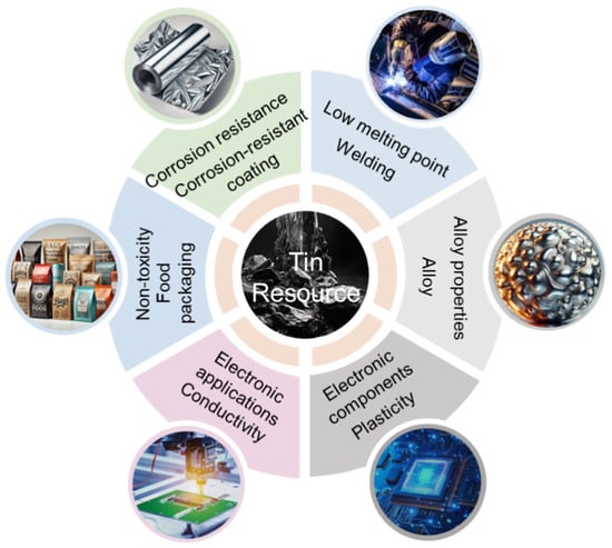 Tin (Sn) is indispensable in both industry and daily life, widely utilized in electronics, electrical appliances, information technology, construction materials, machinery, the automotive industry, aerospace, and nuclear energy due to its stable chemical properties, resistance to oxidation, low melting point, excellent ductility, and non-toxic nature (Figure 1) [1,2,3,4,5]. With the growing demand for Sn in emerging fields, the consumption of tin metal is steadily increasing [6,7,8]. However, the increasingly prominent bottleneck in resource supply severely restricts the development of the tin industry [9,10]. Currently, high-grade tin ores used for tin production have been largely depleted, and how to harness low-grade tin ores for production has become a pressing issue [11,12,13].
