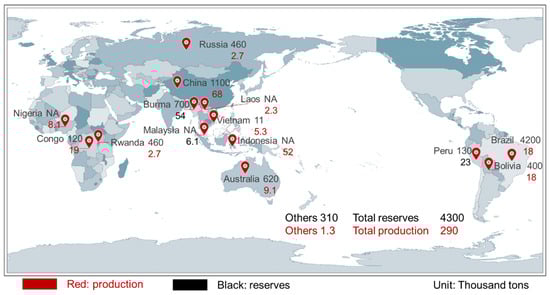 According to the data compilation from the United States Geological Survey (USGS), the global proven Sn reserves are estimated to be approximately 4.3 million tons in 2024, which primary located in Western Africa, Southeastern Asia, Australia, Bolivia, Brazil, Indonesia, and Russia [14,15]. The global production of Sn is approximately 290,000 tons, primarily in China, Indonesia, Myanmar, and Peru. Figure 2 illustrates the distribution of global Sn resources and the Sn ore production of the leading nations.