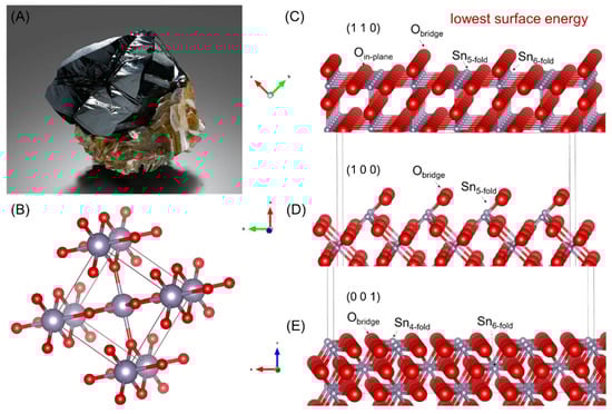 (A) Cassiterite image; (B) cassiterite crystal; (C) cassiterite (1 1 0) surface; (D) cassiterite (1 0 0) surface; (E) cassiterite (0 0 1) surface [40].