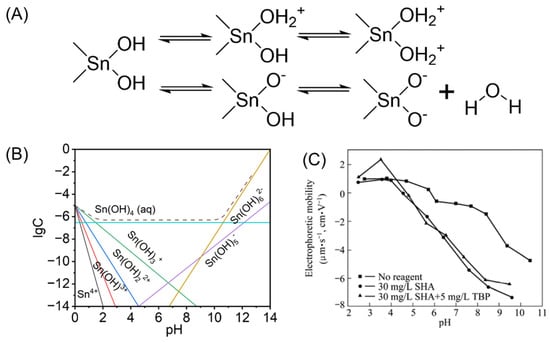 (A) Surface electrical model of cassiterite. (B) Dissolved components of cassiterite [41]. (C) Relationship between SHA and electrophoretic mobility, pH [50].