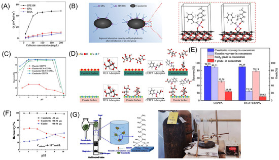 (A) Relationship between adsorption capacity of SPE108, SPA, and BHA on cassiterite and dosage [78]. (B) Model of interaction between SPE108 and cassiterite [78]. (C–E) Separation effect and model of HCA + CEPPA on cassiterite and fluorite [80]. (F) Relationship between pH and recovery rate in HDDPA separation of cassiterite and calcite [82]. (G) Model of interaction between HDDPA and cassiterite [82].