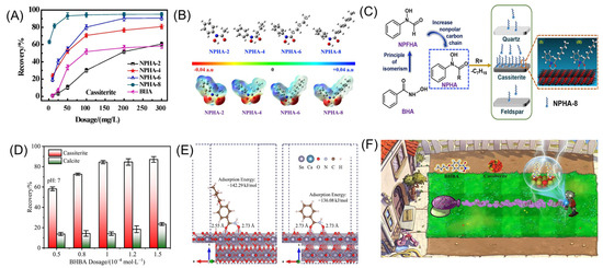 Familiar hydroxamic acid-based collectors include octylhydroxamic acid (OHA), salicylhydroxamic acid (SHA), and benzohydroxamic acid (BHA). The mechanism of action involves the polar groups in the hydroxamic acid forming chelate rings on the surface of cassiterite, primarily through chemical adsorption, accompanied by physical adsorption [91,92]. Aromatic hydrocarbon-based hydroxamic acids, such as SHA and BHA, require activation by Pb2+ to exhibit enhanced selectivity and collecting ability [93,94,95]. The flotation behavior of hydrocarbon-based hydroxamic acids is closely related to the length of the carbon chain. Hydrocarbon hydroxamic acid salts with longer carbon chains exhibit smaller energy gaps and larger dipole moments, making them more prone to adsorption on the SnO2 surface through chelate ring formation. An appropriate increase in carbon chain length enhances the collecting ability of hydrocarbon hydroxamic acid salts on cassiterite under acidic to weakly alkaline conditions [96]. Lu [97] synthesized N-phenylacetylisohydroxamic acid (NPHA) by modifying the structure of BHA. As shown in Figure 9A, the effect of the carbon chain length on the flotation performance was investigated. The results indicated that NPHA-6 and NPHA-8 exhibit superior flotation performance on cassiterite compared to BHA, effectively separating cassiterite, quartz, and feldspar over a wide pH range. Both form five-membered chelate rings on the mineral surface through chemical adsorption (Figure 9B,C). Recently, collectors derived from hydroxamic acid with functional group modifications have been progressively applied in cassiterite flotation. Ren [98] proposed the introduction of a butoxy group into the molecular structure of BHA to synthesize 4-butoxy-N-hydroxybenzamide (BHBA). When used as a collector in the flotation separation of cassiterite and calcite, BHBA maintained the selectivity of BHA while enhancing its collecting ability (Figure 9D). This improvement was attributed to its longer hydrophobic carbon chain and the electron-donating properties of the butoxy group (Figure 9E,F). Wu [99] investigated the performance of 2-hydroxy-3-naphthylmethylisohydroxamic acid (NHA) in cassiterite flotation. In the presence of NHA, the maximum recovery of cassiterite reached 91.76%. The hydroxyl groups of NHA chemically coordinate with the Sn-OH groups on the cassiterite surface, forming a six-membered chelate ring. This mechanism can be extended to systems involving the interaction of most metal ions with hydroxyl group-containing isohydroxamic acids, which helps to further understand the role of isohydroxamic acid collectors in cassiterite flotation.