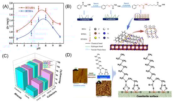 Enhancing the selectivity of hydroxamic acid-based collectors is a primary research focus. Hydrocarbon-based hydroxamic acids exhibit good collecting ability, but their main drawback is poor selectivity. Sun [100] proposed enhancing the self-assembly and adsorption of sulfur-containing ether hydroxamic acids on the cassiterite surface through amide groups. He [101] synthesized two novel collectors: 2-(benzylthio)-acetohydroxamic acid (BTHA) and N-(6-(hydroxyamino)-6-oxhexyl) benzylthioacetamide (BTAHA). By modifying the molecular structure of sulfur-containing ether hydroxamic acids, these compounds’ activity and dispersibility in water were enhanced, facilitating a stronger interaction between the collector and the mineral. The flotation results and mechanistic model are shown in Figure 10A,B. Compared to BTHA, BTAHA exhibits stronger bubble stability, making it more readily adsorbed onto the mineral surface and promoting hydrophobic flotation. Qi [102] synthesized a novel collector, N-[(3-hydroxyamino)-propoxy]-N-octyldithiocarbamate (OAHD), by adding a sulfur-containing side chain at the same end, forming both -NC(=S)S- and -C(=O)NHOH bifunctional groups. The sulfur-containing side chain demonstrated differential adsorption, showing adsorption on the cassiterite surface but no adsorption on the calcite surface, thereby enhancing the surface hydrophilicity of calcite and achieving effective selective enrichment of cassiterite (Figure 10C,D). Studies have shown that increasing the number of hydroxamic groups can separate the target mineral from gangue minerals [103,104]. Aromatic hydrocarbon-based hydroxamic acids exhibit good selectivity but have poor hydrophobicity. By adding oxygen-containing substituents (-OCH3) or hydrophobic chains to the benzene ring of benzohydroxamic acid, the flotationability of the mineral can also be enhanced. Thus, Zhao [105] synthesized p-methoxybenzohydroxamic acid (PMOB) as a novel collector to improve the recovery of cassiterite in flotation. The recovery rate of cassiterite using PMOB as a collector was 90.08%, compared to a recovery rate of 84.67% using BHA. The -OCH3 substituent imparts to PMOB a stronger electron-donating ability and hydrophobicity compared to BHA, p-methylbenzohydroxamic acid (PMB), and p-hydroxybenzohydroxamic acid (PHB), thereby enhancing its flotation performance. In summary, hydroxamic acid-based collectors form stable chelate rings with cassiterite, offering advantages such as high selectivity, strong collecting ability, and environmental friendliness, demonstrating significant potential for development in flotation practices.