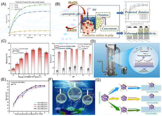 (A,B) Flotation effect and cassiterite flotation model of NaOL/SAOX [112]. (C,D) Flotation effect and cassiterite flotation model of Pb-BHA/SDBS [113]. (E,F) Flotation effect and cassiterite flotation model of SHA/DBIA [115]. (G) Cassiterite flotation model of SDS/OHA [116].
