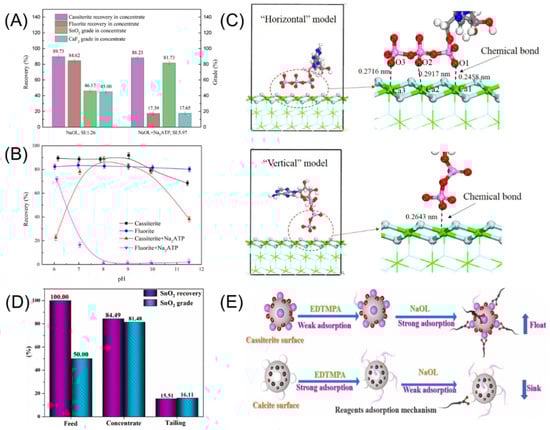 (A–C) Cassiterite flotation effect and model of Na2ATP [142]. (D,E) Cassiterite flotation model of EDTMPA [143].
