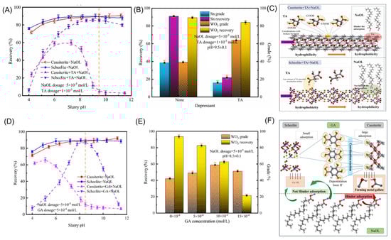 (A,B) Depression effect of TA on scheelite and cassiterite [152]. (C) Cassiterite flotation model of TA [152]. (D,E) Depression effect of GA on scheelite and cassiterite [153]. (F) Cassiterite flotation model of GA [153].