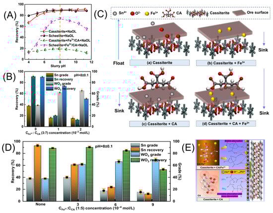 Fe3+/CA cassiterite flotation effect (A,B) and model (C) [161]. Fe2+/CA cassiterite flotation effect (D) and model (E) [66].