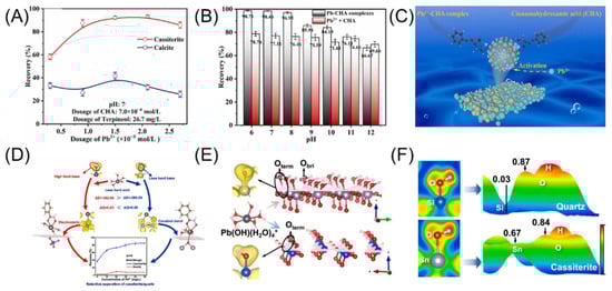 (A–C) Cassiterite flotation effect and model of Pb2+-CHA [167]. (D–F) Model for selective activation mechanism analysis of cassiterite in quartz by Pb2+ [168].
