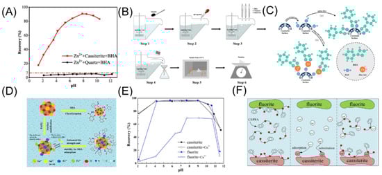 (A) Cassiterite flotation effect and model of Zn2+-BHA [170]. (B,C) Cassiterite flotation model of Fe2+-SHA [171]. (D–F) Cassiterite flotation effect and model of Cu2+-CEPPA [172].