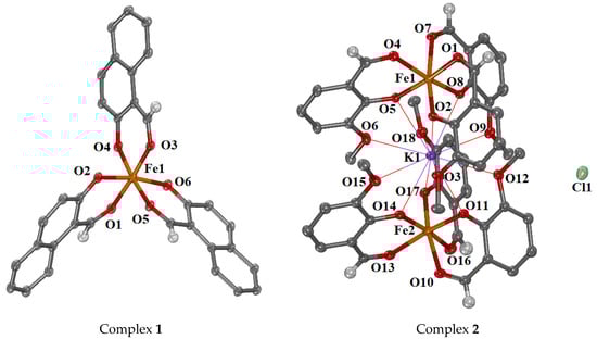 Complex 1 was crystallized in the monoclinic crystal system and C2/c space group (Table S1). The molecular structure of complex 1 is shown in Figure 3, and selected bond lengths and angles are summarized in Table S2. Complex 1 is a mononuclear iron(III) complex consisting of three deprotonated 1naph-salo− ligands (Figure 3). The 1naph-salo− ligands are coordinated to iron(III) ions in a bidentate chelating mode through their carbonyl oxygen (O1, O3, and O5) and their phenolato (O2, O4, and O6)-oxygen atoms with Fe1–O bond distances in the range 1.965(3)–2.042(3) Å (Table 1). Such bidentate coordination is typical for the 1naph-salo− ligands reported in the structures of diverse metal complexes [54,55,56]. The largest angles in the coordination sphere of Fe(III) are in the range 169.30(14)–175.24(13)° (Table S2), indicating a distorted octahedral geometry.