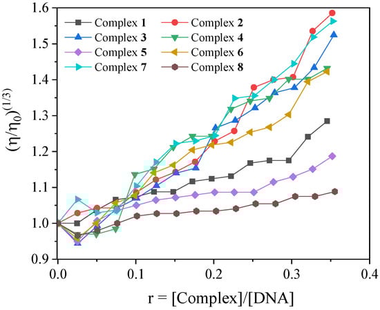 DNA viscosity measurements were performed in order to clarify the interaction mode of the complexes with DNA. Such measurements are useful since the changes in relative DNA viscosity are proportional to changes in relative DNA length. An increase in DNA viscosity is observed in the presence of classic intercalative agents whose insertion in between DNA bases increases the overall DNA-length. On the other hand, in the case of the nonclassical intercalator (i.e., including groove binders or compounds such as electrostatic interactions), practically stable or slightly decreased DNA viscosity is observed [77]. In the case of complexes 1–8, the viscosity of a CT DNA solution (0.1 mM) was measured in the presence of incrementally increasing concentrations of each complex (Figure 4). For all the complexes, an increase in viscosity was noticed, which suggests an intercalative mode of interaction.