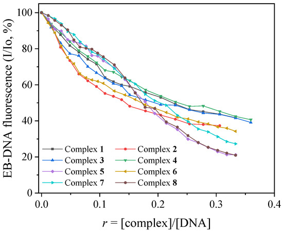 The plot of relative EB-DNA fluorescence emission intensity at λemission = 593 nm (I/Io, %) versus r (r = [complex]/[DNA]) in the presence of complexes 1–8 (up to 41.7% of the initial EB-DNA fluorescence for complex 1; 37.4% for complex 2; 39.1% for complex 3; 40.7% for complex 4; 21.2% for complex 5; 34.2% for complex 6; 27.3% for complex 7; and 20.9% for complex 8).