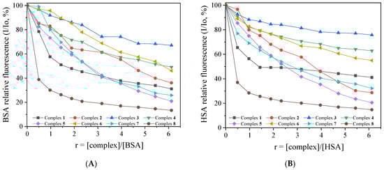 Serum albumin (SA) is among the most abundant proteins of the circulatory system, with many biological roles, such as the regulation of normal blood volume and osmotic pressure and the reversible binding and transportation of drugs and other bioactive small molecules. Therefore, studying the interaction between albumins (either HSA or its structural analog BSA) with bioactive compounds may contribute to revealing altered new mechanistic pathways or differentiated biological properties of these compounds upon their interaction with SAs [78]. Within this context, the interaction of complexes 1–8 with BSA and HSA was studied with fluorescence emission spectroscopy.