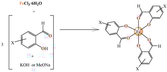 Substituted salicylaldehydes (X-saloH, Figure 1) are produced from salicylaldehyde (2-hydroxy–benzaldehyde, saloH, Figure 1), which is a natural product found in many metabolic procedures such as metabolites, intermediates, or defensive chemicals [23]. Many of the existing X-saloH compounds exhibit interesting antimicrobial and antioxidant activity, depending on the nature of the substituents [24,25,26]. This interesting biological profile, along with their ability to form stable complexes through strong bidentate coordination via the aldehyde and phenolato-oxygen atoms, has triggered many studies over the past few years. Within this context, different metal ions (such as Mn(II), Fe(III), Co(II), Ni(II), Cu(II), Zn(II), Ru(II), Pd(II), Cd(II), Mo(VI)O2, Re(V)O, and Er(III)) have been used for the preparation of complexes with substituted salicylaldehydes [27,28,29,30,31,32,33,34,35,36,37,38,39,40,41,42,43,44,45,46,47,48]. Although the biological properties of most of those complexes have been studied, there are not many reports on the biological activity of iron complexes with this family of ligands [49,50].