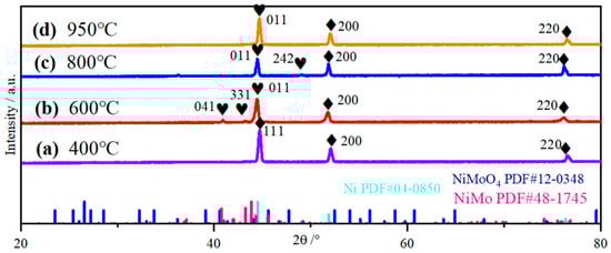 Figure 1 illustrates the X-ray diffraction (XRD) spectra of four NiMo/NF electrode samples prepared at different reduction temperatures (the ‘heart’ and ‘diamond’ symbols in the figure represent Ni and NiMo, respectively). It can be observed that diffraction peaks corresponding to the (111), (200) and (220) crystal planes appear at 44.50°, 51.85°, and 76.38°, respectively, which are in agreement with the standard data for NF (PDF#04-0850). Under the reduction conditions at 600 °C, 800 °C, and 950 °C (Figure 1b–d), the diffraction peaks of the (200) and (220) crystal planes were shifted to the left, indicating an increase in the crystal plane spacing, which may be due to the doping of Mo ions, which have a larger radius than that of Ni ions. In addition, diffraction peaks corresponding to the (011), (041), (331) and (242) crystal planes appeared at 44.34°, 41°, 43°, and 49.18°, respectively, which were consistent with the standard data for NiMo alloys (PDF#48-1745) [36]. In Figure 1a, the diffraction peaks of NiMo alloy were not observed, which may be due to the low reduction temperature (400 °C), which did not allow a sufficient reduction reaction to take place. The differences in atomic radii and electronegativity of Ni and Mo resulted in lattice distortion, which led to the formation of diverse structures on some of the crystalline surfaces, which manifested as new NiMo alloy diffraction peaks, such as (041) and (331) crystalline peaks (Figure 1b) and (242) crystalline peaks (Figure 1c). The relatively weak intensity and broadening of these diffraction peaks [37] indicate the presence of defects in the crystal structure, leading to an increase in surface energy [37]. These structural changes contribute to the enhancement of the hydrogen evolution reaction (HER) activity, which significantly increases the hydrogen precipitation rate. When the reduction temperature was raised to 950 °C, the diffusion rates of Ni and Mo ions increased, facilitating the formation of Ni-Mo alloys. Consequently, the intensity of the diffraction peaks corresponding to the (011) crystal plane of NiMo was significantly enhanced (see Figure 1d), indicating an improvement in the integrity of the crystal structure [38,39,40]. In addition, by comparing with the standard data of Ni (PDF#48-1745), no obvious NiMoO4 diffraction peaks were found, which indicates that NiMoO4 has amorphous structural properties.