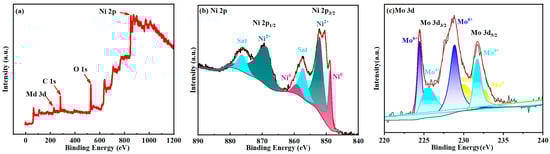 XPS spectra of NiMo-600 °C/NF sample: (a) full spectrum, (b) Ni 2p; (c) Mo 3d.