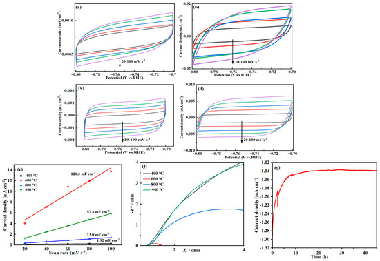 Cyclic voltammograms of nickel–molybdenum alloys in a 1.0 M NaOH solution at different scan rates in the non-Faradaic region under different calcination–reduction temperatures: (a) 400 °C, (b) 600 °C, (c) 800 °C, and (d) 950 °C. The scan range is from −0.8 V to −0.7 V vs. RHE, where the scan rates range from 20 mV/s to 100 mV/s, and the temperature is 25 °C. (e) The curve of the electrochemically active surface area of nickel–molybdenum alloy catalysts under different calcination–reduction temperatures. (f) Electrochemical impedance spectra of nickel–molybdenum alloy catalysts under different calcination–reduction temperatures. (g) Stability diagram of the nickel–molybdenum alloy catalyst at 600 °C measured by chronopotentiometry (CP).