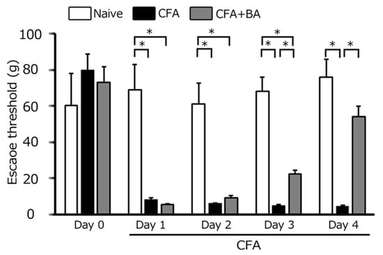 The development of inflammatory hyperalgesia following CFA injection into the whisker pad was assessed by quantifying mechanical escape thresholds using von Frey filaments applied to the injected site and orofacial skin. On day 0, no significant difference in escape threshold was observed among the three groups (naïve: 60.2 ± 17.9 g; CFA: 80.0 ± 8.9 g; CFA + BA: 73.3 ± 8.4 g). Consistent with hyperalgesia, Figure 1 demonstrates a significant reduction in mechanical escape threshold in the ipsilateral whisker pad of inflamed rats, decreasing from 76.0 ± 9.8 g in naïve rats to 4.7 ± 0.4 g at day 4 post-CFA injection (n = 6, p < 0.05; Figure 1). Notably, no significant alteration in mechanical escape threshold was observed in the contralateral whisker pad between the naïve and inflamed groups (60.2 ± 17.9 g vs. 80.0 ± 8.9 g, n = 6, NS).
