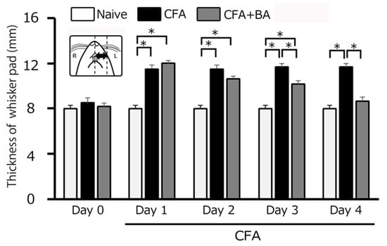Comparison of changes in complete Freund’s adjuvant (CFA)-induced inflammatory edema among naïve, inflamed, and butyrate (BA)-treated inflamed rats. Each column represents the mean thickness of the edematous area in the whisker pad for three groups of rats. *, p < 0.05, comparing naïve rats (n = 5) vs. CFA-inflamed rats (n = 6), and CFA-inflamed rats vs. CFA-inflamed rats 4 days after butyric acid (BA) (50 mg/kg, intraperitoneal) treatment (n = 6). Inset: a schematic diagram illustrating the region used for measuring the CFA-induced orofacial inflammatory edema.