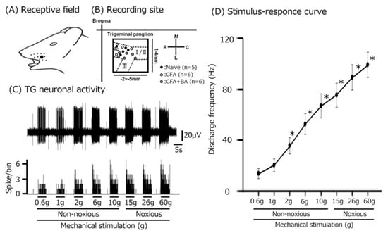 Response properties of trigeminal ganglion (TG) neurons to mechanical stimulation of facial skin. (A) Receptive field of the whisker pad on the facial skin (blackened area). (B) Distribution of TG neurons responding to non-noxious and noxious mechanical stimulation of the facial skin (n = 17) among naïve, CFA-inflamed, and butyrate (BA)-treated CFA-inflamed rats. The inset illustrates an example of TG recording-site identification (2–5 mm posterior to bregma and 1–4 mm lateral to midline). R, rostral; C, caudal; M, medial; L, lateral. Trigeminal nerve branches (I, II, and III). (C) Representative examples of TG neuronal activity evoked by non-noxious (2, 4, 6, 8, and 10 g) and noxious (15, 26, and 60 g) mechanical stimulation of the orofacial skin. Upper trace: TG neuronal activity; lower trace: post-stimulus time histogram. (D) The stimulus–response relationship for SpVc WDR neurons (n = 17). * p < 0.05 for comparison of 0.6 g vs. 2 g, 6 g, 10 g, 15 g, 26 g, and 60 g.