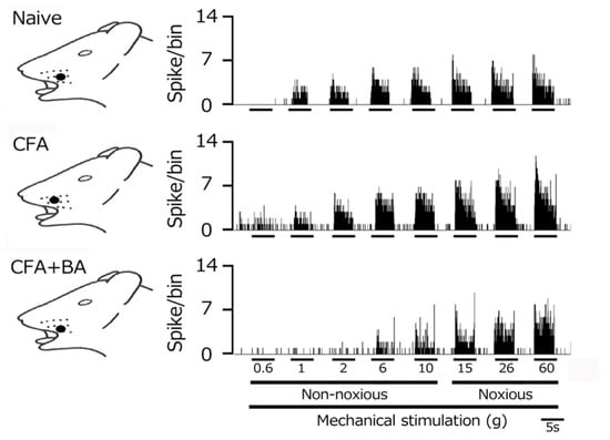 Following orofacial complete Freund’s adjuvant (CFA) inflammation, the hyperexcitability of trigeminal ganglion (TG) neuronal activity was reversed by butyrate (BA) administration. Representative examples of TG neuronal responses to non-noxious and noxious mechanical stimuli are shown for naïve rats, CFA-inflamed rats, and CFA-inflamed rats treated with butyrate (BA) (50 mg/kg, intraperitoneally for four days). The receptive field of the whisker pad on the facial skin is shown (blackened area). Note that the reduced mechanical stimulation threshold and increased spontaneous nerve impulse frequency observed in inflamed rats returned to control levels following four days of butyrate administration.