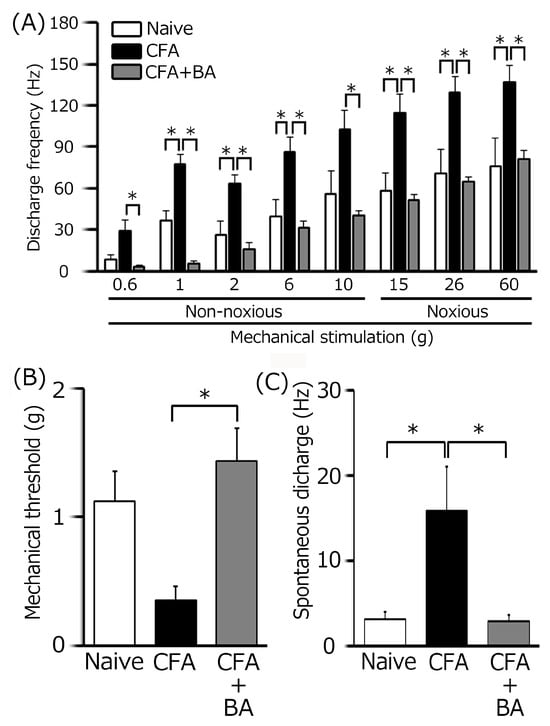 To elucidate the therapeutic effects of chronic butyrate administration on inflammation-induced TG neuronal hyperexcitability, we utilized a behavioral escape threshold assay. Figure 4 illustrates representative TG neuronal discharge rates in response to non-noxious (0.6–10 g) and noxious (15–60 g) mechanical stimulation following four days of butyrate treatment. After this treatment period, TG neuronal discharge frequencies in response to both non-noxious and noxious mechanical stimuli were normalized to control levels (Figure 4), suggesting a reversal of inflammation-induced neuronal sensitization. Butyrate administration also effectively restored the lowered mechanical threshold and augmented spontaneous and evoked firing frequencies observed in inflamed rats to levels comparable to naïve controls. As shown in Figure 5A, mean TG neuronal discharge rates in response to both non-noxious and noxious stimuli were significantly reduced following butyrate administration (6 g, CFA vs. CFA + BA, 86.1 ± 10.6 Hz vs. 31.0 ± 5.4 Hz; 60 g, CFA vs. CFA + BA, 136.3 ± 12.8 Hz vs. 80.7 ± 6.7 Hz, p < 0.05), indicating a reduction in neuronal excitability. Similarly, the mean mechanical threshold was significantly reversed to control levels after butyrate treatment (Figure 5B), suggesting a restoration of normal mechanical sensitivity. Furthermore, spontaneous discharge rates of TG neurons were significantly decreased following butyrate administration (CFA vs. CFA + BA, 15.9 ± 5.3 Hz vs. 2.9 ± 0.7 Hz, Figure 5C, p < 0.05), suggesting a reduction in neuronal activity. In contrast, chronic vehicle administration had no significant impact on the spontaneous or mechanical stimulation-evoked hyperexcitability of TG neurons in inflamed rats.