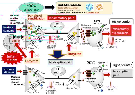 The possible mechanism underlying the systemic administration of butyrate inhibits inflammatory pain. Following peripheral inflammation, inflammatory mediators, such as prostaglandin E2 (PGE2), bind to G-protein-coupled E-type prostanoid (EP) receptors and induce the activation of protein kinase (PK) A and PKC in nociceptive peripheral terminals, leading to the phosphorylation of mechanosensitive transient receptor potential ankyrin 1/acid-sensing ion channels (TRPA1, ASIC), voltage-gated Na (Nav), and K (Kv) channels. As a result, the activation threshold for transducer channels, such as the TRP channel family, is reduced, and the membrane excitability of the peripheral terminal increases, resulting in a high frequency of action potentials being conducted to presynaptic central terminals of the trigeminal spinal nucleus caudalis (SpVc). This results in the release of a large amount of glutamate into the synaptic cleft, which binds to upregulated postsynaptic glutamate receptors, augmenting excitatory postsynaptic potentials (EPSPs), causing a barrage of action potentials to be conducted to higher centers of pain pathways, and creating a state of heightened sensitivity, termed peripheral sensitization. The systemic administration of butyrate attenuates the mechanical inflammatory hyperalgesia associated with the hyperexcitability of SpVc neurons via the inhibition of peripheral cyclooxygenase-2 (Cox-2) cascade signaling pathways and the inhibition of N-/T-type voltage-gated Ca (Cav) channels, and this effect restores the SpVc neuronal hyperactivity to control levels.