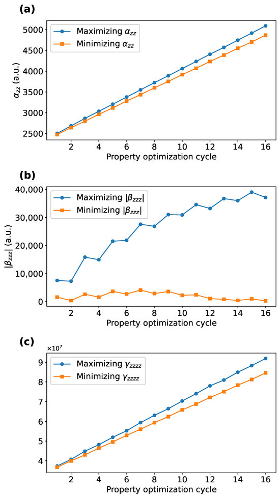 Figure 1. Comparison of the target properties of the resulting PFu at each POPT cycle, under conditions of maximizing and minimizing the respective properties: (a) α z z ; (b) | β z z z | ; (c) γ z z z z .