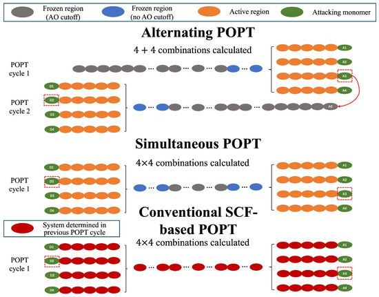 In previous studies, the alternating POPT has been demonstrated to be more efficient than both the conventional SCF-based POPT [5], as well as the existing simultaneous POPT [9], in which monomers are simultaneously attached to both terminals of the system [37,38]. This efficiency advantage has been thoroughly discussed in previous work, both theoretically and in terms of practical computational performance. As illustrated in Figure 2, the three POPT schemes are briefly revisited through a simple case study, in which one of the four types of monomers (green ellipses marked with “A” or “D”) is appended to both ends of the system (represented by ellipses of other colors). To achieve this goal, the conventional SCF-based POPT must examine all ( 4 × 4 ) possible combinations in a single POPT cycle, selecting the optimal monomer based on (hyper)polarizabilities calculated using conventional FF for each combination. Since all SCF calculations at this stage are performed on the entire system (red and green ellipses), the computational cost of the conventional SCF-based POPT is significantly higher than that of the other two ELG-based POPT schemes. Among the remaining two ELG-based POPT schemes, the alternating POPT exhibits a greater efficiency advantage, which can be attributed to two main factors. First, in both alternating and simultaneous POPT schemes, the ELG-SCF calculations are restricted to the interactive space (orange and green ellipses). However, in the alternating POPT, a larger portion of the system lies far from the interactive space and can thus be treated using AO cutoff, leading to a significant reduction in computational cost. Second, since the alternating POPT proceeds in an alternating manner at the two terminals, the number of required combinations is reduced from ( 4 × 4 ) to ( 4 + 4 ) , resulting in a further gain in efficiency.