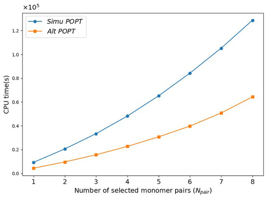 Figure 3. Comparison of the actual CPU time required by alternating POPT and simultaneous POPT for selecting N p a i r monomers in the minimization of α z z .