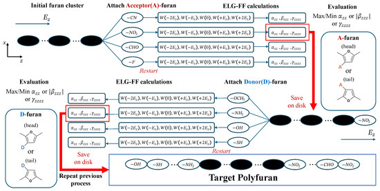 The monomer that meets specific criteria will be selected by evaluating the ELG-FF-calculated (hyper)polarizabilities. It is worth noting that monomers can be evaluated and selected according to a user-defined evaluation function, enabling a more flexible and diverse material design process. By modifying this function, such as defining it as the deviation between a calculated property (e.g., the band gaps) and a predefined target value, the design process can be directed toward materials with specific desired properties. We plan to develop and test this functionality further in future studies. Geometric coordinates and electronic structures of the new PFu with the selected monomer will be saved for the next POPT cycle. At the beginning of the next POPT cycle, four donor-substituted furan (D-furan) monomers will be added to the left terminal of the new PFu determined in the previous cycle, and the subsequent processing will be the same as before. By repeating the aforementioned cycles alternating between the left and right terminals, the design of a PFu with specific NLO properties can be accomplished.
