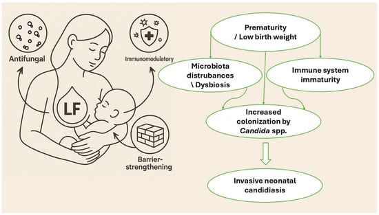 A characteristic feature of the neonatal period is the immaturity of the gastrointestinal system. This is manifested by higher gastric pH, reduced digestive enzyme activity, and increased gut–blood barrier permeability [15,43]. Additionally, in breastfed newborns, protein digestion is further limited due to the presence of protease inhibitors in colostrum. As a result, a significant portion of lactoferrin ingested with milk remains in the intestine and may enter the bloodstream [15]. LF, especially in its iron-saturated form, shows high resistance to proteolytic enzymes in the stomach, pancreas, and small intestine [15]. Studies have demonstrated that both hLf and bLf can be detected in the feces of infants in intact or partially digested form, confirming their stability in the neonatal gastrointestinal tract and potential for systemic activity [52]. Figure 1 shows the mechanisms of action of LF and the risk factors leading to invasive neonatal candidiasis.
