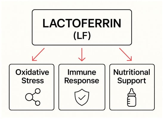 LF releases previously bound iron in the acidic environment of phagolysosomes (e.g., in neutrophils and macrophages), where the pH drops to 3–4. The resulting Fe2+ ions can generate ROS, which possess vigorous cytotoxic activity against pathogens. Thus, beyond its protective role for host cells, LF enhances the microbicidal potential of phagocytes, supporting the immune response [15]. Additionally, LF acts as a potent antioxidant not only by directly scavenging ROS but also by enhancing the activity of endogenous antioxidant enzymes such as superoxide dismutase (SOD) and glutathione peroxidase. These effects reduce lipid peroxidation products and hydrogen peroxide concentrations in the blood. A general increase in plasma antioxidant capacity has also been observed, underscoring LF’s systemic protective role and its potential in preventing chronic diseases associated with oxidative stress [18].