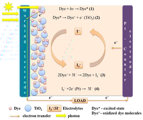 Light absorption occurs because of a monolayer of dye chemically adsorbed on the surface of a semiconductor (e.g., TiO2) (1). After excitation by a light photon, the dye gives up an electron to the semiconductor (TiO2) (2), i.e., it passes into the conduction band of TiO2. The transition occurs very quickly and takes 10−15 s. In the semiconductor, the electron diffuses through the TiO2 film and reaches the glass electrode. The dye molecule is oxidized with the loss of an electron. The dye molecule is restored to its original state by obtaining an electron from the oxidation–reduction medium (electrolyte) (3). To complete the cycle, the electrolytic medium is neutralized by photoelectrons that reach the counter electrode through the external circuit (4). According to this principle, a dye-sensitized solar cell converts solar energy into electric current flowing through an external conductor [30,31]. To prevent liquid from leaking out during operation of the device, the cell is made hermetically sealed [31,32].