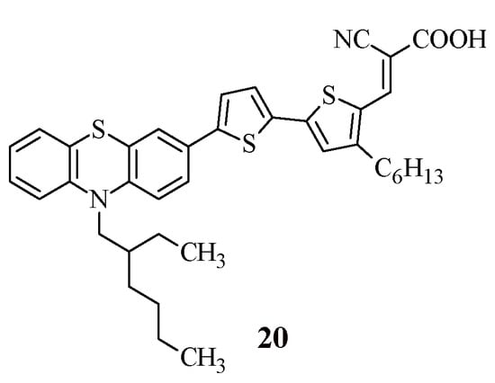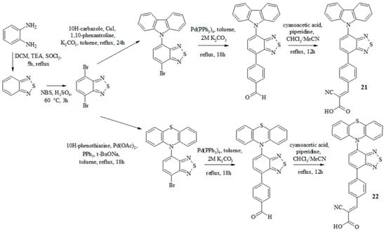 Recently, dyes 21 and 22 were synthesized, containing carbazole or phenothiazine as an electron-donor fragment as well as benzothiadiazole as an auxiliary acceptor, benzene as a π-bridge, and cyanoacrylic acid as an anchor group [44] (Scheme 5).