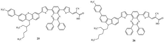 Recently, D-D-π-A-π-A quinoxaline dyes 25 and 26 were synthesized, differing from each other in the type of electron-donor fragment (Figure 4) [47].